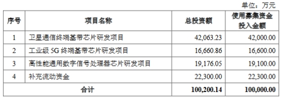 中科晶上原拟在上交所科创板公开发行股票数量不超过1000.00万股(不含采用超额配售选择权发行的股份数量),不低于本次发行后总股本的25.00%;本次发行全部为新股发行,原股东不公开发售股份。中科晶上拟募集资金10.00亿元,其中4.2亿元用于卫星通信终端基带芯片研发项目,1.66亿元用于工业级5G终端基带芯片研发项目,1.91元用于高性能通用数字信号处理器芯片研发项目,2.23亿元用于补充流动资金。