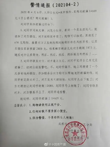 四川农业大学大四女生刘某在小红书网购被骗2609元后,她不选择报警而是上网搜寻反诈专线帮忙找回损失,不料再被骗12000元。两次被骗后,刘某向成都市公安局温江区分局公平派出所报案。4月7日,公平派出所发布了此案的警情通报,引发网友关注。