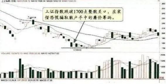 在熊市末期,主力会通过各种方式制造恐慌气氛,让市场感到重要的技术关口守不住了,当投资者纷纷斩仓时,主力却突然拉升。在牛市初期,指数面临整数位、前期高点、阻力位等重要技术关口,投资者缺乏信心,认为大盘难以突破之时,主力却利用自身的优势,坚决突破,使场外资金跟风追涨,让大多数投资者充当抬轿者,如图所示。