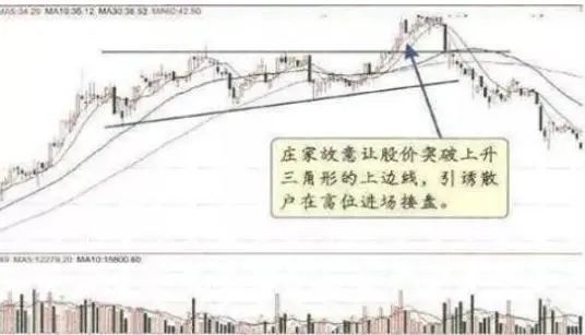看多的典型技术形态有双重底、多重底、V形底、头肩底、圆底等底部形态,以及上升三角形、上升旗形、下降楔形等上升趋势中的整理形态。由于多数投资者将看多的典型技术形态作为买进的依据,主力为了在高位派发筹码,往往会制造出看多的技术形态,形成蓄势上攻的假象,导致市场人气高涨,买盘汹涌,然后乘机出逃。如图所示。