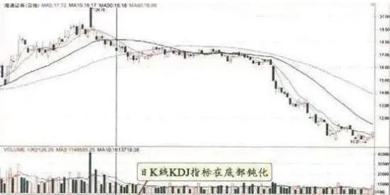 主力利用技术指标设置多头陷阱时,往往有意让技术指标在底部钝化或让其产生底背离,让投资者以为股票已经严重超卖而买入。例如出货时,周K线的KDJ指标处于高位,主力会让日K线的KDJ指标在底部钝化,以掩护出货,如图所示。