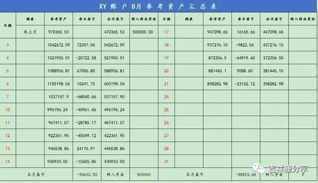 XY账户8月21日资产汇总表:截止8月21日,XY账户参考资产858282.98元,浮盈358282.98元。