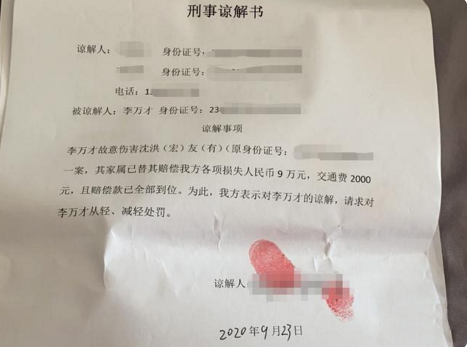 记者从双方家属处获悉,检察院提起公诉前,曹某梅与沈洪友家属达成《赔偿协议》,一次性赔偿对方死亡赔偿金、被扶养人生活费等9万余元;沈洪友家属则出具了《谅解书》,请求法院对李万才从轻、减轻处罚。