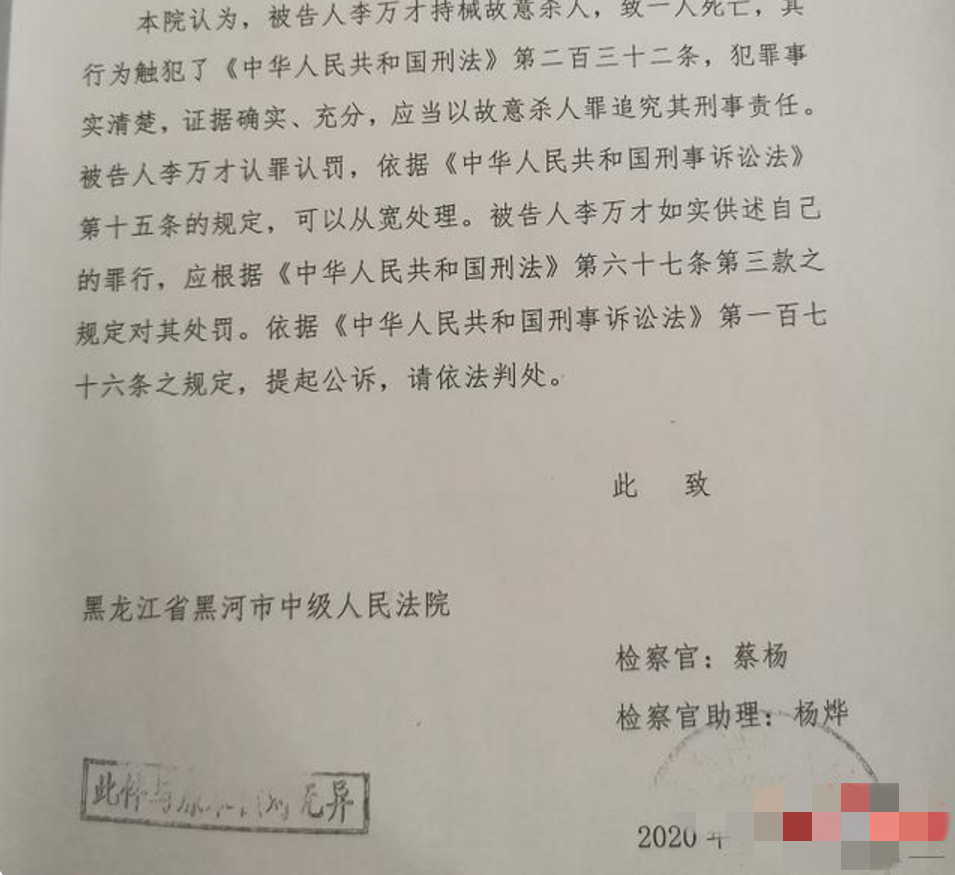 检方已就李万才涉嫌故意杀人一案向黑河市中院提起公诉