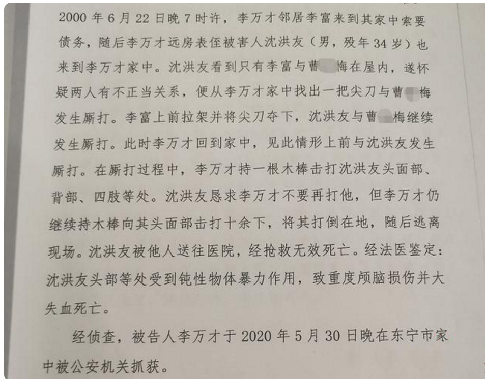 记者获取的案件资料显示,警方经依法侦查查明,2000年6月22日晚,李万才卖完菜回家,发现沈洪友与其妻子曹某梅撕扯,因沈洪友经常欺负其家人,并威胁杀死其家人,李万才与沈洪友发生厮打,从屋内厮打到院内,李万才顺手操起一根木棒朝沈洪友头部打了一下,将沈洪友打倒在地,沈洪友从地上起来打李万才,又被李万才用木棒击中头部,沈洪友再次倒地,李万才用木棒朝沈洪友头部及身上打了数下后,将木棒扔在院内后潜逃,沈洪友于次日早上在医院死亡。