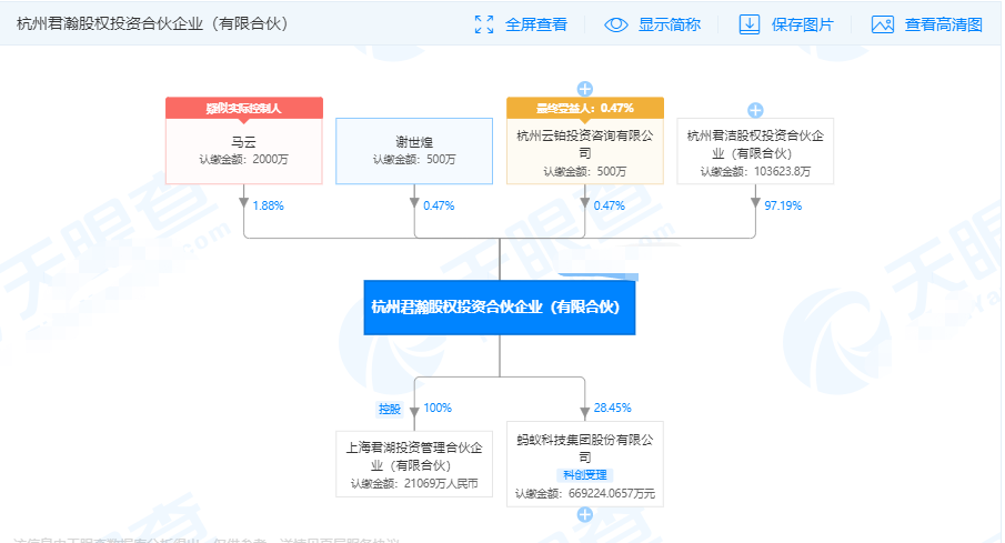 上面我们所提到的杭州君瀚和杭州君澳都是蚂蚁金服的员工持股平台,其中杭州君瀚跟马云有很大的关联,下面我们来看一下杭州君瀚的股权透析就知道。
