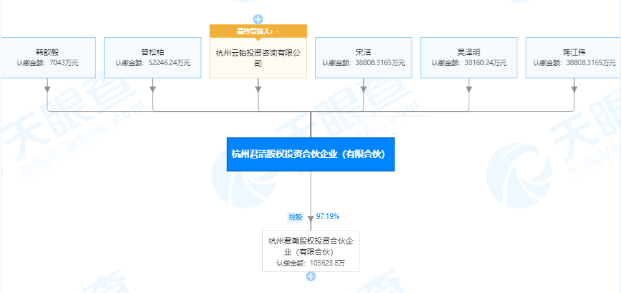 杭州君洁股权投资合伙企业由蚂蚁金服集团的5个员工持股,另外杭州云铂投资咨询有限公司也持有杭州君杰股权的股份,而且是最终的受益人。