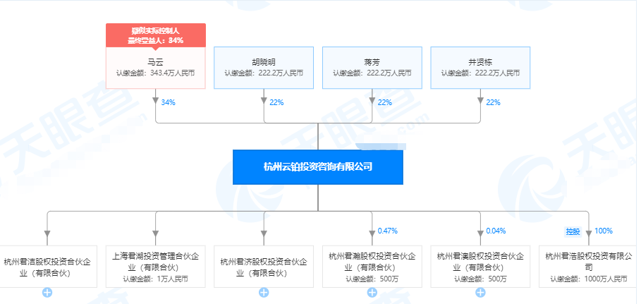 而杭州云铂投资咨询有限公司原来是由马云100%控股的,只不过在2020年8月18日,马云将 66%的股权平均转让给蚂蚁金服执行董事长井贤栋、首席执行官胡晓明、以及非执行董事蒋芳,这三个人各持股22%。目前云铂由蚂蚁金服由4个员工持股,其中井贤栋持股22%,蒋方持股22%,胡晓明持股22%,马云持股34%。