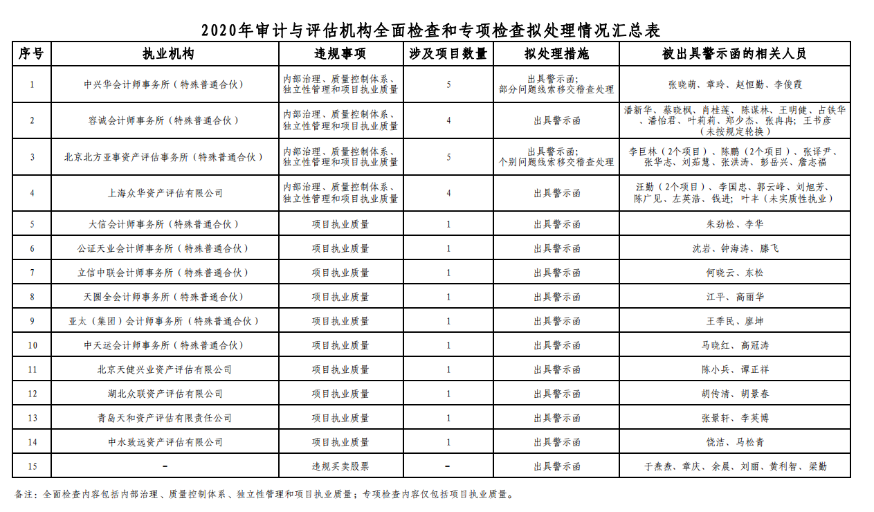 根据本次全面检查及专项检查情况,拟对8家次审计机构及28人次注册会计师、6家次评估机构及27人次资产评估师、6名违法买卖股票的执业人员采取出具警示函的行政监管措施并记入诚信档案,同时对部分涉嫌违法违规的问题线索移交稽查处理。各证监局根据检查情况对105家次审计机构及225人次注册会计师、22家次评估机构及47人次资产评估师分别采取了出具警示函、监管谈话等行政监管措施并记入诚信档案。