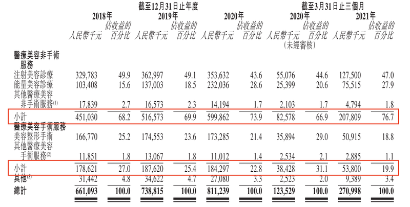 伊美尔的业务可以分为医疗美容非手术服务和医疗美容手术服务两大板块,前者主要包括注射美容诊疗及能量美容诊疗,而后者则主要为美容整形手术,报告期内非手术服务业务为公司贡献了绝大部分收益。