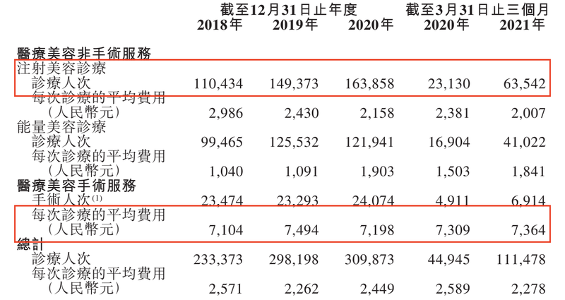不过注射美容诊疗业务消费者每次诊疗的平均费用却在逐年下滑,2018年至2020年分别为2986元、2430元和2158元,2021年一季度人均诊疗费用更是降至2007元。