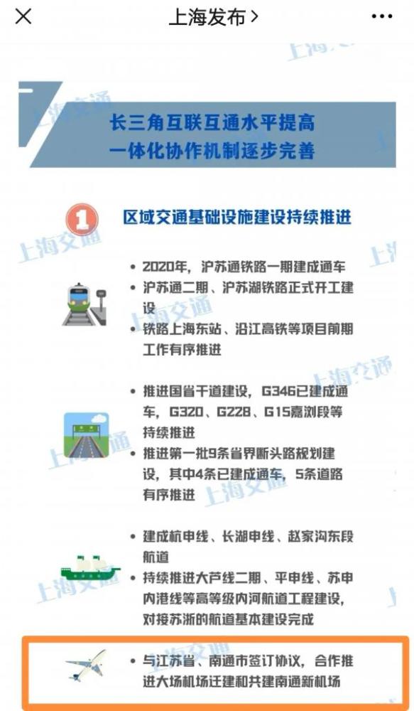 在对外交通方面,上海市在“十三五”期间,“长三角互联互通水平提高一体化协作机制逐步完善”,并明确:上海市与江苏省、南通市签订协议,合作推进大场机场迁建和共建南通新机场。