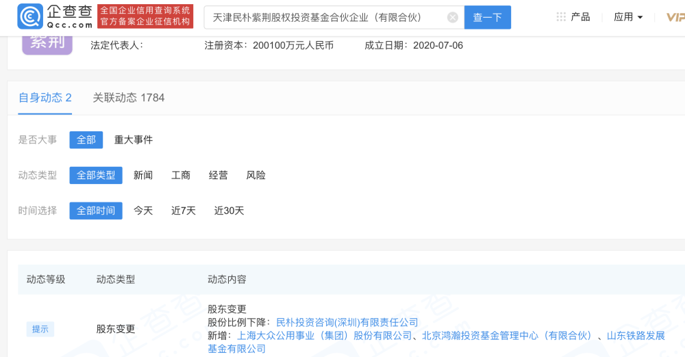 企查查信息显示,天津民朴紫荆股权投资基金合伙企业(有限合伙)成立于2020年7月,经营范围含以私募基金从事股权投资、投资管理、资产管理等活动。企查查股东信息显示,该公司大股东为民朴投资咨询(深圳)有限责任公司,持股比例65.2174%,大众公用为第二大股东,持股比例24.9875%。山东铁路发展基金有限公司为第四大股东,持股比例4.74%。