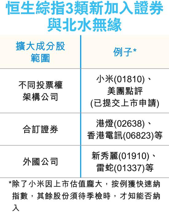 恒指公司5月完成咨询,落实在恒生综指加入不同投票权架构公司、外国公司及合订证券三类证券(见表)。按现行惯例,当股份一旦被加入为恒生综合指数,即自动成为港股通的北水投资范围,但由于小米为首家获纳入该指数的同股不同权公司,以往未有先例可循,市场早注视内地交易所会否突然落闸或如期放行。
