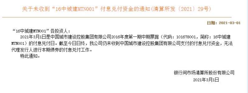 3月1日,上清所发布公告,3月1日是“16中城建MTN001”的付息兑付日。截至今日日终,上清所仍未收到中国城市建设控股集团有限公司支付的付息兑付资金,无法代理发行人进行本期债券的付息兑付工作。