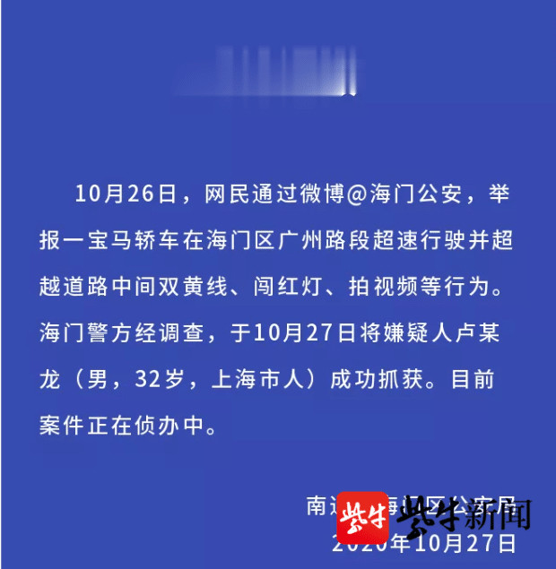 由于该段飙车视频上除了显示出车辆品牌、车速外,可供确认追查嫌疑人员的关键点——违法时间无法确认。海门公安连夜组织交警、图像中心等部门综合运用多种手段进行倒推,对广州路沿线的视频监控等资料进行研判。10月27日14时许,终于揪出了狐狸的尾巴。当天16时许,嫌疑人卢某龙(男,32岁,上海市人)在海门开发区某企业内被抓获,警方同时查扣了其所驾驶的宝马7系轿车。目前,案件正在侦办中。