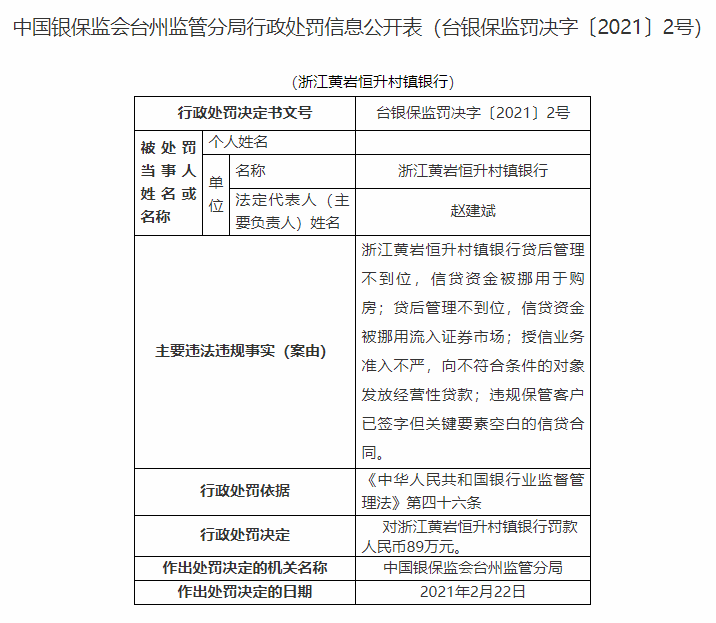 同日,浙江黄岩恒升村镇银行因贷后管理不到位,信贷资金被挪用于购房;贷后管理不到位,信贷资金被挪用流入证券市场;授信业务准入不严,向不符合条件的对象发放经营性贷款;违规保管客户已签字但关键要素空白的信贷合同,被罚89万元。