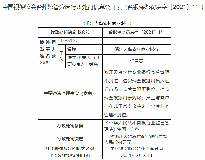 2月26日,中国银保监会台州监管分局行政处罚信息公开表显示,中国银保监会台州监管分局对浙江天台农村商业银行罚款人民币94万元。主要违法违规事实为贷后管理不到位,信贷资金被挪用流入证券市场;贷后管理不到位,信贷资金被挪用于购房;员工与客户存在非正常资金往来;金库业务管理不到位。